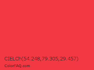 CIELCh 54.248,79.305,29.457 Color is a normal red color and the nearest color is Red Salsa #fd3a4a. Hex code #f23943 and RGB value is rgb(242,57,67). In RGB color space, this color is composed of 95% red, 22% green, 26% blue, In CMYK color space, this color is composed of 0% cyan, 76% magenta, 72% yellow , 5% black , In HSL color space, this color has a hue angle of 357° , 88% saturation and 59% lightness.