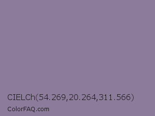 CIELCh 54.269,20.264,311.566 Color is a normal purple color and the nearest color is Mamba #8e8190. Hex code #8d7b9c and RGB value is rgb(141,123,156). In RGB color space, this color is composed of 55% red, 48% green, 61% blue, In CMYK color space, this color is composed of 10% cyan, 21% magenta, 0% yellow , 39% black , In HSL color space, this color has a hue angle of 273° , 14% saturation and 55% lightness.