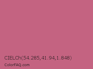 CIELCh 54.285,41.94,1.848 Color is a normal rose color and the nearest color is Cinnamon Satin #cd607e. Hex code #c46381 and RGB value is rgb(196,99,129). In RGB color space, this color is composed of 77% red, 39% green, 51% blue, In CMYK color space, this color is composed of 0% cyan, 49% magenta, 34% yellow , 23% black , In HSL color space, this color has a hue angle of 341° , 45% saturation and 58% lightness.