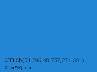 CIELCh 54.286,48.757,271.001 Color is a normal blue color and the nearest color is Curious Blue #2596d1. Hex code #2286d6 and RGB value is rgb(34,134,214). In RGB color space, this color is composed of 13% red, 53% green, 84% blue, In CMYK color space, this color is composed of 84% cyan, 37% magenta, 0% yellow , 16% black , In HSL color space, this color has a hue angle of 207° , 73% saturation and 49% lightness.