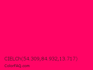 CIELCh 54.309,84.932,13.717 Color is a normal rose color and the nearest color is Vivid Raspberry #ff006c. Hex code #ff0464 and RGB value is rgb(255,4,100). In RGB color space, this color is composed of 100% red, 2% green, 39% blue, In CMYK color space, this color is composed of 0% cyan, 98% magenta, 61% yellow , 0% black , In HSL color space, this color has a hue angle of 337° , 100% saturation and 51% lightness.