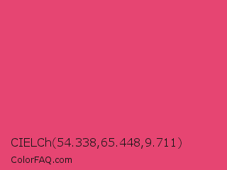 CIELCh 54.338,65.448,9.711 Color is a normal rose color and the nearest color is Cabaret #d94972. Hex code #e64572 and RGB value is rgb(230,69,114). In RGB color space, this color is composed of 90% red, 27% green, 45% blue, In CMYK color space, this color is composed of 0% cyan, 70% magenta, 50% yellow , 10% black , In HSL color space, this color has a hue angle of 343° , 76% saturation and 59% lightness.