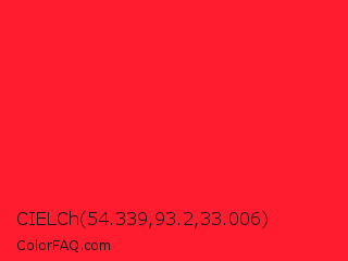 CIELCh 54.339,93.2,33.006 Color is a normal red color and the nearest color is Torch Red #fd0e35. Hex code #ff1c2f and RGB value is rgb(255,28,47). In RGB color space, this color is composed of 100% red, 11% green, 18% blue, In CMYK color space, this color is composed of 0% cyan, 89% magenta, 82% yellow , 0% black , In HSL color space, this color has a hue angle of 355° , 100% saturation and 55% lightness.