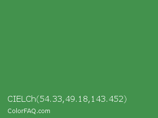 CIELCh 54.33,49.18,143.452 Color is a normal green color and the nearest color is May Green #4c9141. Hex code #43924d and RGB value is rgb(67,146,77). In RGB color space, this color is composed of 26% red, 57% green, 30% blue, In CMYK color space, this color is composed of 54% cyan, 0% magenta, 47% yellow , 43% black , In HSL color space, this color has a hue angle of 128° , 37% saturation and 42% lightness.