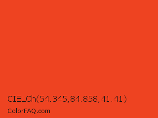 CIELCh 54.345,84.858,41.41 Color is a normal red color and the nearest color is Pomegranate #f34723. Hex code #ee4321 and RGB value is rgb(238,67,33). In RGB color space, this color is composed of 93% red, 26% green, 13% blue, In CMYK color space, this color is composed of 0% cyan, 72% magenta, 86% yellow , 7% black , In HSL color space, this color has a hue angle of 10° , 86% saturation and 53% lightness.