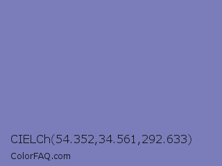 CIELCh 54.352,34.561,292.633 Color is a normal blue color and the nearest color is Wild Blue Yonder #7a89b8. Hex code #7a7db9 and RGB value is rgb(122,125,185). In RGB color space, this color is composed of 48% red, 49% green, 73% blue, In CMYK color space, this color is composed of 34% cyan, 32% magenta, 0% yellow , 27% black , In HSL color space, this color has a hue angle of 237° , 31% saturation and 60% lightness.
