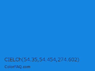 CIELCh 54.35,54.454,274.602 Color is a normal blue color and the nearest color is Bright Navy Blue #1974d2. Hex code #1485e0 and RGB value is rgb(20,133,224). In RGB color space, this color is composed of 8% red, 52% green, 88% blue, In CMYK color space, this color is composed of 91% cyan, 41% magenta, 0% yellow , 12% black , In HSL color space, this color has a hue angle of 207° , 84% saturation and 48% lightness.