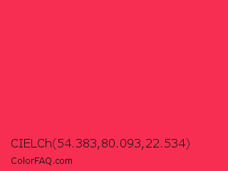 CIELCh 54.383,80.093,22.534 Color is a normal red color and the nearest color is Sizzling Red #ff3855. Hex code #f72e52 and RGB value is rgb(247,46,82). In RGB color space, this color is composed of 97% red, 18% green, 32% blue, In CMYK color space, this color is composed of 0% cyan, 81% magenta, 67% yellow , 3% black , In HSL color space, this color has a hue angle of 349° , 93% saturation and 57% lightness.