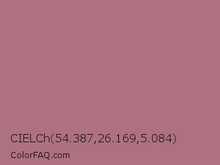 CIELCh 54.387,26.169,5.084 Color is a normal red color and the nearest color is Turkish Rose #b57281. Hex code #ae717f and RGB value is rgb(174,113,127). In RGB color space, this color is composed of 68% red, 44% green, 50% blue, In CMYK color space, this color is composed of 0% cyan, 35% magenta, 27% yellow , 32% black , In HSL color space, this color has a hue angle of 346° , 27% saturation and 56% lightness.