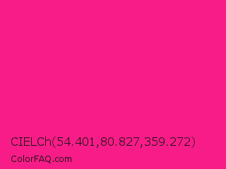 CIELCh 54.401,80.827,359.272 Color is a normal rose color and the nearest color is Fluorescent Pink #ff1493. Hex code #f71c87 and RGB value is rgb(247,28,135). In RGB color space, this color is composed of 97% red, 11% green, 53% blue, In CMYK color space, this color is composed of 0% cyan, 89% magenta, 45% yellow , 3% black , In HSL color space, this color has a hue angle of 331° , 93% saturation and 54% lightness.