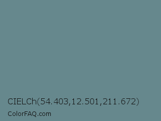 CIELCh 54.403,12.501,211.672 Color is a normal cyan color and the nearest color is Steel Teal #5f8a8b. Hex code #66888d and RGB value is rgb(102,136,141). In RGB color space, this color is composed of 40% red, 53% green, 55% blue, In CMYK color space, this color is composed of 28% cyan, 4% magenta, 0% yellow , 45% black , In HSL color space, this color has a hue angle of 188° , 16% saturation and 48% lightness.