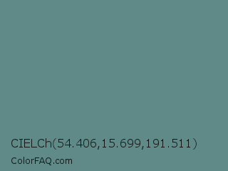 CIELCh 54.406,15.699,191.511 Color is a normal cyan color and the nearest color is Steel Teal #5f8a8b. Hex code #5f8a87 and RGB value is rgb(95,138,135). In RGB color space, this color is composed of 37% red, 54% green, 53% blue, In CMYK color space, this color is composed of 31% cyan, 0% magenta, 2% yellow , 46% black , In HSL color space, this color has a hue angle of 176° , 18% saturation and 46% lightness.