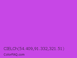 CIELCh 54.409,91.332,321.51 Color is a normal purple color and the nearest color is Medium Orchid #ba55d3. Hex code #c747e6 and RGB value is rgb(199,71,230). In RGB color space, this color is composed of 78% red, 28% green, 90% blue, In CMYK color space, this color is composed of 13% cyan, 69% magenta, 0% yellow , 10% black , In HSL color space, this color has a hue angle of 288° , 76% saturation and 59% lightness.