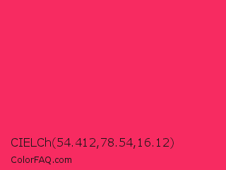 CIELCh 54.412,78.54,16.12 Color is a normal rose color and the nearest color is Radical Red #ff355e. Hex code #f72b61 and RGB value is rgb(247,43,97). In RGB color space, this color is composed of 97% red, 17% green, 38% blue, In CMYK color space, this color is composed of 0% cyan, 83% magenta, 61% yellow , 3% black , In HSL color space, this color has a hue angle of 344° , 93% saturation and 57% lightness.