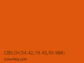 CIELCh 54.42,79.43,50.988 Color is a normal orange color and the nearest color is Bamboo #da6304. Hex code #de570c and RGB value is rgb(222,87,12). In RGB color space, this color is composed of 87% red, 34% green, 5% blue, In CMYK color space, this color is composed of 0% cyan, 61% magenta, 95% yellow , 13% black , In HSL color space, this color has a hue angle of 21° , 90% saturation and 46% lightness.