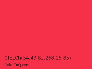 CIELCh 54.43,81.268,25.85 Color is a normal red color and the nearest color is Red Salsa #fd3a4a. Hex code #f7304a and RGB value is rgb(247,48,74). In RGB color space, this color is composed of 97% red, 19% green, 29% blue, In CMYK color space, this color is composed of 0% cyan, 81% magenta, 70% yellow , 3% black , In HSL color space, this color has a hue angle of 352° , 93% saturation and 58% lightness.