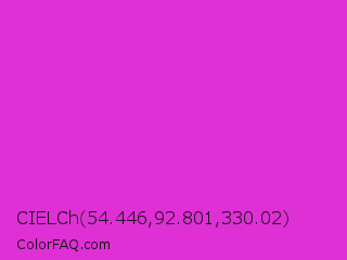 CIELCh 54.446,92.801,330.02 Color is a normal magenta color and the nearest color is Steel Pink #cc33cc. Hex code #de30d4 and RGB value is rgb(222,48,212). In RGB color space, this color is composed of 87% red, 19% green, 83% blue, In CMYK color space, this color is composed of 0% cyan, 78% magenta, 5% yellow , 13% black , In HSL color space, this color has a hue angle of 303° , 73% saturation and 53% lightness.