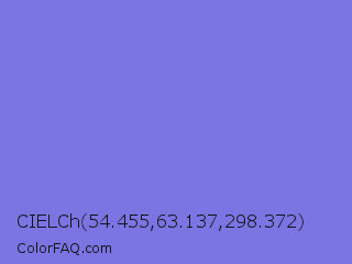 CIELCh 54.455,63.137,298.372 Color is a light indigo color and the nearest color is Moody Blue #7f76d3. Hex code #7a75e3 and RGB value is rgb(122,117,227). In RGB color space, this color is composed of 48% red, 46% green, 89% blue, In CMYK color space, this color is composed of 46% cyan, 48% magenta, 0% yellow , 11% black , In HSL color space, this color has a hue angle of 243° , 66% saturation and 67% lightness.