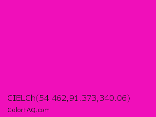 CIELCh 54.462,91.373,340.06 Color is a normal magenta color and the nearest color is Shocking Pink #fc0fc0. Hex code #f00fba and RGB value is rgb(240,15,186). In RGB color space, this color is composed of 94% red, 6% green, 73% blue, In CMYK color space, this color is composed of 0% cyan, 94% magenta, 23% yellow , 6% black , In HSL color space, this color has a hue angle of 314° , 88% saturation and 50% lightness.