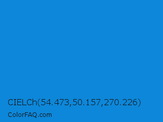 CIELCh 54.473,50.157,270.226 Color is a normal blue color and the nearest color is Rich Electric Blue #0892d0. Hex code #0d87d9 and RGB value is rgb(13,135,217). In RGB color space, this color is composed of 5% red, 53% green, 85% blue, In CMYK color space, this color is composed of 94% cyan, 38% magenta, 0% yellow , 15% black , In HSL color space, this color has a hue angle of 204° , 89% saturation and 45% lightness.