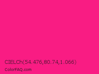 CIELCh 54.476,80.74,1.066 Color is a normal rose color and the nearest color is Fluorescent Pink #ff1493. Hex code #f81c83 and RGB value is rgb(248,28,131). In RGB color space, this color is composed of 97% red, 11% green, 51% blue, In CMYK color space, this color is composed of 0% cyan, 89% magenta, 47% yellow , 3% black , In HSL color space, this color has a hue angle of 332° , 94% saturation and 54% lightness.