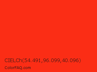 CIELCh 54.491,96.099,40.096 Color is a normal red color and the nearest color is Red RYB #fe2712. Hex code #fb2d15 and RGB value is rgb(251,45,21). In RGB color space, this color is composed of 98% red, 18% green, 8% blue, In CMYK color space, this color is composed of 0% cyan, 82% magenta, 92% yellow , 2% black , In HSL color space, this color has a hue angle of 6° , 97% saturation and 53% lightness.