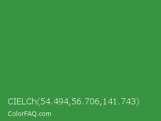 CIELCh 54.494,56.706,141.743 Color is a normal green color and the nearest color is May Green #4c9141. Hex code #399442 and RGB value is rgb(57,148,66). In RGB color space, this color is composed of 22% red, 58% green, 26% blue, In CMYK color space, this color is composed of 61% cyan, 0% magenta, 55% yellow , 42% black , In HSL color space, this color has a hue angle of 126° , 44% saturation and 40% lightness.