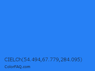 CIELCh 54.494,67.779,284.095 Color is a normal blue color and the nearest color is Blue Crayola #1f75fe. Hex code #2680f5 and RGB value is rgb(38,128,245). In RGB color space, this color is composed of 15% red, 50% green, 96% blue, In CMYK color space, this color is composed of 84% cyan, 48% magenta, 0% yellow , 4% black , In HSL color space, this color has a hue angle of 214° , 91% saturation and 55% lightness.