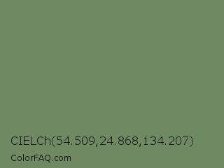 CIELCh 54.509,24.868,134.207 Color is a normal green color and the nearest color is Highland #6f8e63. Hex code #6f8a63 and RGB value is rgb(111,138,99). In RGB color space, this color is composed of 44% red, 54% green, 39% blue, In CMYK color space, this color is composed of 20% cyan, 0% magenta, 28% yellow , 46% black , In HSL color space, this color has a hue angle of 102° , 16% saturation and 46% lightness.