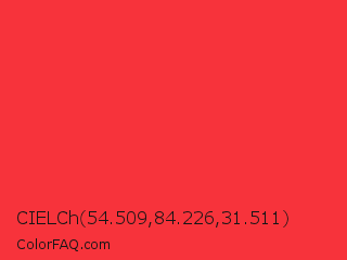CIELCh 54.509,84.226,31.511 Color is a normal red color and the nearest color is Deep Carmine Pink #ef3038. Hex code #f7333b and RGB value is rgb(247,51,59). In RGB color space, this color is composed of 97% red, 20% green, 23% blue, In CMYK color space, this color is composed of 0% cyan, 79% magenta, 76% yellow , 3% black , In HSL color space, this color has a hue angle of 358° , 92% saturation and 58% lightness.
