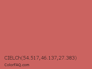 CIELCh 54.517,46.137,27.383 Color is a normal red color and the nearest color is Fuzzy Wuzzy #cc6666. Hex code #cb6360 and RGB value is rgb(203,99,96). In RGB color space, this color is composed of 80% red, 39% green, 38% blue, In CMYK color space, this color is composed of 0% cyan, 51% magenta, 53% yellow , 20% black , In HSL color space, this color has a hue angle of 2° , 51% saturation and 59% lightness.