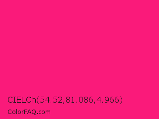 CIELCh 54.52,81.086,4.966 Color is a normal rose color and the nearest color is Fluorescent Pink #ff1493. Hex code #fa1a7a and RGB value is rgb(250,26,122). In RGB color space, this color is composed of 98% red, 10% green, 48% blue, In CMYK color space, this color is composed of 0% cyan, 90% magenta, 51% yellow , 2% black , In HSL color space, this color has a hue angle of 334° , 96% saturation and 54% lightness.