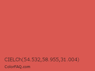 CIELCh 54.532,58.955,31.004 Color is a normal red color and the nearest color is Jelly Bean #da614e. Hex code #da5851 and RGB value is rgb(218,88,81). In RGB color space, this color is composed of 85% red, 35% green, 32% blue, In CMYK color space, this color is composed of 0% cyan, 60% magenta, 63% yellow , 15% black , In HSL color space, this color has a hue angle of 3° , 65% saturation and 59% lightness.