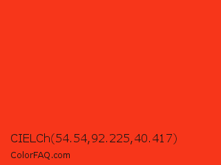 CIELCh 54.54,92.225,40.417 Color is a normal red color and the nearest color is Red RYB #fe2712. Hex code #f7361a and RGB value is rgb(247,54,26). In RGB color space, this color is composed of 97% red, 21% green, 10% blue, In CMYK color space, this color is composed of 0% cyan, 78% magenta, 89% yellow , 3% black , In HSL color space, this color has a hue angle of 8° , 93% saturation and 54% lightness.