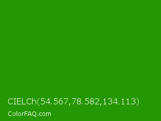 CIELCh 54.567,78.582,134.113 Color is a dark green color and the nearest color is Slimy Green #299617. Hex code #249702 and RGB value is rgb(36,151,2). In RGB color space, this color is composed of 14% red, 59% green, 1% blue, In CMYK color space, this color is composed of 76% cyan, 0% magenta, 99% yellow , 41% black , In HSL color space, this color has a hue angle of 106° , 97% saturation and 30% lightness.