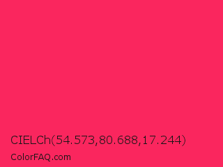 CIELCh 54.573,80.688,17.244 Color is a normal rose color and the nearest color is Awesome #ff2052. Hex code #fa265e and RGB value is rgb(250,38,94). In RGB color space, this color is composed of 98% red, 15% green, 37% blue, In CMYK color space, this color is composed of 0% cyan, 85% magenta, 62% yellow , 2% black , In HSL color space, this color has a hue angle of 344° , 95% saturation and 56% lightness.