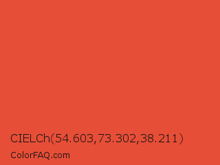 CIELCh 54.603,73.302,38.211 Color is a normal red color and the nearest color is Carmine Pink #eb4c42. Hex code #e64e37 and RGB value is rgb(230,78,55). In RGB color space, this color is composed of 90% red, 31% green, 22% blue, In CMYK color space, this color is composed of 0% cyan, 66% magenta, 76% yellow , 10% black , In HSL color space, this color has a hue angle of 8° , 78% saturation and 56% lightness.