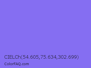 CIELCh 54.605,75.634,302.699 Color is a light indigo color and the nearest color is Medium Slate Blue #7b68ee. Hex code #856ef2 and RGB value is rgb(133,110,242). In RGB color space, this color is composed of 52% red, 43% green, 95% blue, In CMYK color space, this color is composed of 45% cyan, 55% magenta, 0% yellow , 5% black , In HSL color space, this color has a hue angle of 250° , 84% saturation and 69% lightness.