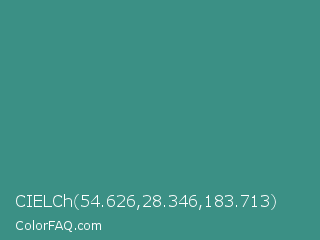 CIELCh 54.626,28.346,183.713 Color is a normal cyan color and the nearest color is Lochinvar #2c8c84. Hex code #3b9085 and RGB value is rgb(59,144,133). In RGB color space, this color is composed of 23% red, 56% green, 52% blue, In CMYK color space, this color is composed of 59% cyan, 0% magenta, 8% yellow , 44% black , In HSL color space, this color has a hue angle of 172° , 42% saturation and 40% lightness.