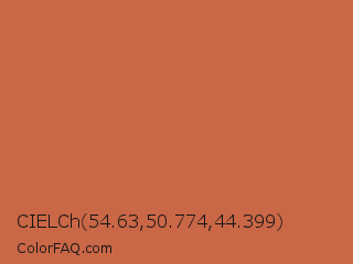 CIELCh 54.63,50.774,44.399 Color is a normal color and the nearest color is Copper Red #cb6d51. Hex code #c96747 and RGB value is rgb(201,103,71). In RGB color space, this color is composed of 79% red, 40% green, 28% blue, In CMYK color space, this color is composed of 0% cyan, 49% magenta, 65% yellow , 21% black , In HSL color space, this color has a hue angle of 15° , 55% saturation and 53% lightness.