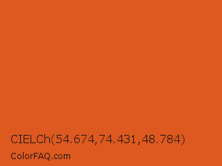 CIELCh 54.674,74.431,48.784 Color is a normal orange color and the nearest color is Flame #e25822. Hex code #dd591f and RGB value is rgb(221,89,31). In RGB color space, this color is composed of 87% red, 35% green, 12% blue, In CMYK color space, this color is composed of 0% cyan, 60% magenta, 86% yellow , 13% black , In HSL color space, this color has a hue angle of 18° , 75% saturation and 49% lightness.