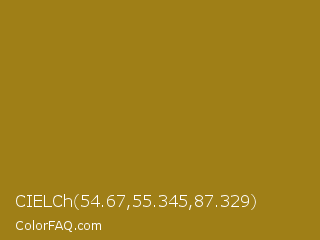 CIELCh 54.67,55.345,87.329 Color is a normal yellow color and the nearest color is Reef Gold #9f821c. Hex code #9f7f17 and RGB value is rgb(159,127,23). In RGB color space, this color is composed of 62% red, 50% green, 9% blue, In CMYK color space, this color is composed of 0% cyan, 20% magenta, 86% yellow , 38% black , In HSL color space, this color has a hue angle of 46° , 75% saturation and 36% lightness.