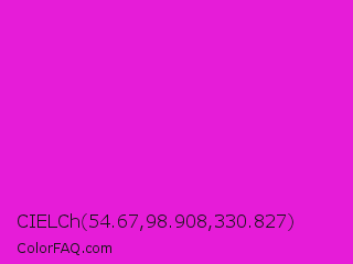 CIELCh 54.67,98.908,330.827 Color is a normal magenta color and the nearest color is Hot Magenta #ff1dce. Hex code #e61cd8 and RGB value is rgb(230,28,216). In RGB color space, this color is composed of 90% red, 11% green, 85% blue, In CMYK color space, this color is composed of 0% cyan, 88% magenta, 6% yellow , 10% black , In HSL color space, this color has a hue angle of 304° , 80% saturation and 51% lightness.