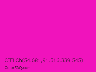 CIELCh 54.681,91.516,339.545 Color is a normal magenta color and the nearest color is Shocking Pink #fc0fc0. Hex code #f013bc and RGB value is rgb(240,19,188). In RGB color space, this color is composed of 94% red, 7% green, 74% blue, In CMYK color space, this color is composed of 0% cyan, 92% magenta, 22% yellow , 6% black , In HSL color space, this color has a hue angle of 314° , 88% saturation and 51% lightness.