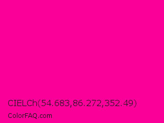 CIELCh 54.683,86.272,352.49 Color is a normal magenta color and the nearest color is Hollywood Cerise #f400a1. Hex code #fa0099 and RGB value is rgb(250,0,153). In RGB color space, this color is composed of 98% red, 0% green, 60% blue, In CMYK color space, this color is composed of 0% cyan, 100% magenta, 39% yellow , 2% black , In HSL color space, this color has a hue angle of 323° , 100% saturation and 49% lightness.