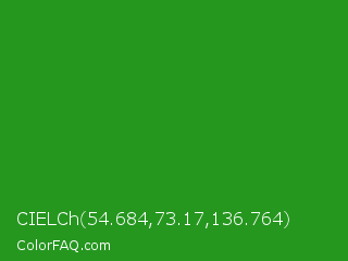 CIELCh 54.684,73.17,136.764 Color is a normal green color and the nearest color is Slimy Green #299617. Hex code #25971f and RGB value is rgb(37,151,31). In RGB color space, this color is composed of 15% red, 59% green, 12% blue, In CMYK color space, this color is composed of 75% cyan, 0% magenta, 79% yellow , 41% black , In HSL color space, this color has a hue angle of 117° , 66% saturation and 36% lightness.
