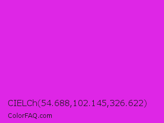 CIELCh 54.688,102.145,326.622 Color is a normal magenta color and the nearest color is Steel Pink #cc33cc. Hex code #de26e6 and RGB value is rgb(222,38,230). In RGB color space, this color is composed of 87% red, 15% green, 90% blue, In CMYK color space, this color is composed of 3% cyan, 83% magenta, 0% yellow , 10% black , In HSL color space, this color has a hue angle of 298° , 79% saturation and 53% lightness.