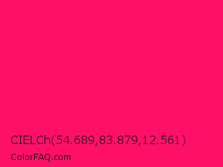 CIELCh 54.689,83.879,12.561 Color is a normal rose color and the nearest color is Vivid Raspberry #ff006c. Hex code #ff1068 and RGB value is rgb(255,16,104). In RGB color space, this color is composed of 100% red, 6% green, 41% blue, In CMYK color space, this color is composed of 0% cyan, 94% magenta, 59% yellow , 0% black , In HSL color space, this color has a hue angle of 338° , 100% saturation and 53% lightness.