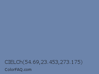 CIELCh 54.69,23.453,273.175 Color is a normal blue color and the nearest color is Bermuda Gray #6b8ba2. Hex code #6c84ab and RGB value is rgb(108,132,171). In RGB color space, this color is composed of 42% red, 52% green, 67% blue, In CMYK color space, this color is composed of 37% cyan, 23% magenta, 0% yellow , 33% black , In HSL color space, this color has a hue angle of 217° , 27% saturation and 55% lightness.