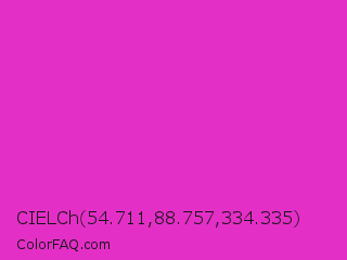 CIELCh 54.711,88.757,334.335 Color is a normal magenta color and the nearest color is Steel Pink #cc33cc. Hex code #e42fc7 and RGB value is rgb(228,47,199). In RGB color space, this color is composed of 89% red, 18% green, 78% blue, In CMYK color space, this color is composed of 0% cyan, 79% magenta, 13% yellow , 11% black , In HSL color space, this color has a hue angle of 310° , 77% saturation and 54% lightness.